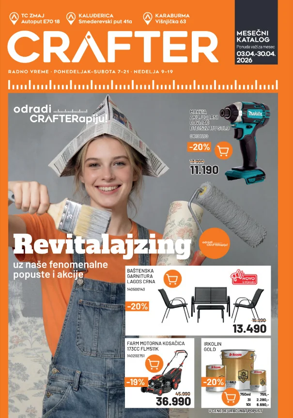 Prelistajte novi Crafter katalog i iskoristite top cene! U ponudi vas čekaju alat, mašine, baštenska oprema, dekoracija i proizvodi za dom uz odlične popuste. Pronađite sve za renoviranje, uređenje i svakodnevne projekte na jednom mestu. Iskoristite super akcije i opremite svoj prostor kvalitetno i povoljno!